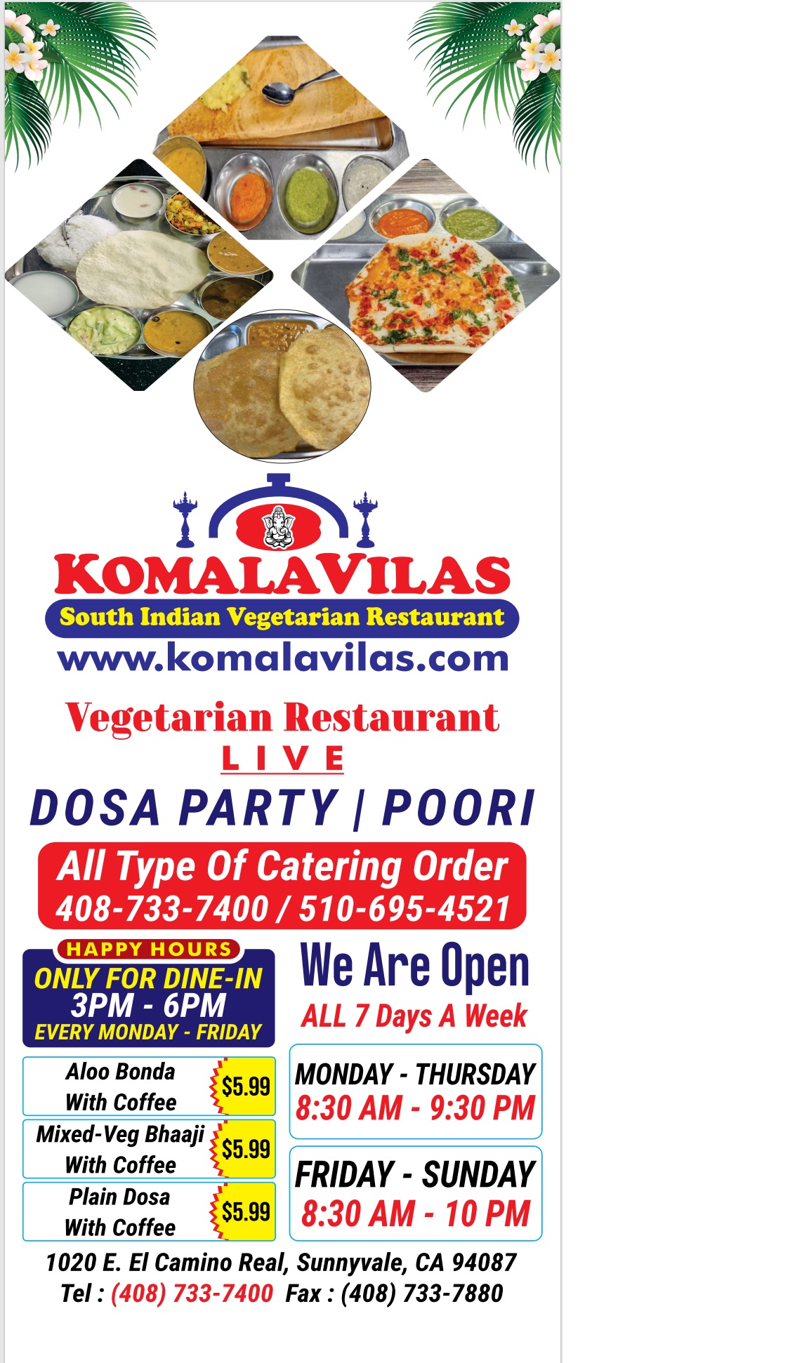 Komala Vilas serves authentic indian restaurant in Sunnyvale. 4.1 ★ Google rating on Google. Dine-in · Takeout.